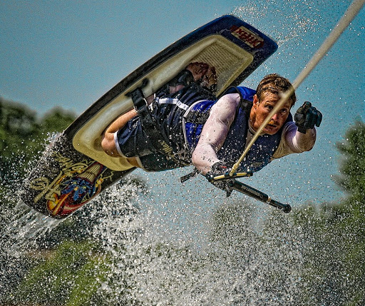 A knee-boarder catches some air at High Rock Lake in North Carolina. A fast shutter speed does two things; it freezes the water spray and allows me to deal with the boat movement underfoot.