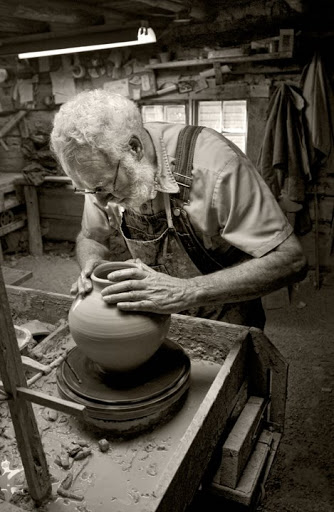 I live in Randolph County, North Carolina which is home to the Seagrove area. Near Seagrove may be one of the largest concentrations of potters anywhere. This pottery heritage goes back to the 18th century. One of the oldest and best known of the traditional potteries is Jugtown. Above, Vernon Owens of Jugtown works on an earthenware jug. Everything he produces is one at a time, by hand.