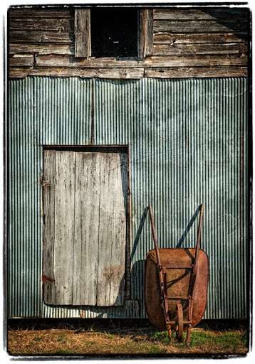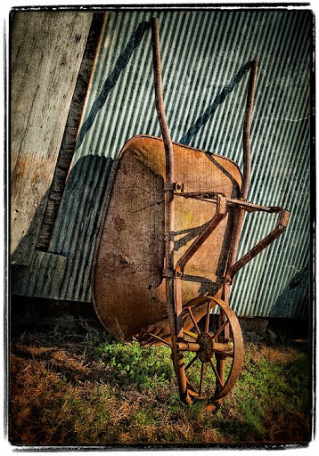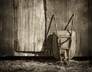 My Grandfather’s old wheelbarrow leans against the wall of the grainery in our barnyard.