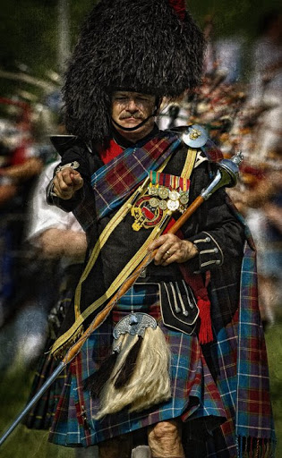 Large sections of North Carolina were settled by Scots in the 18th and 19th centuries. Both my wife and I claim descent from Scottish families. I have been told that there are more people in North Carolina of Scottish descent than there are in Scotland. Whether that is true or not, I do not know, but in recent years there has been a surge in the Scot culture in this state, and elsewhere. Many highland games are held each year throughout the country featuring highland garb and food, bagpipe bands, heavy highland athletics and dancing, with the largest being the annual highland games at Grandfather Mountain in Linville, North Carolina. Both of my sons have participated in these games over the years, my son Tristan as a piper and my son Devin as a flourishing tenor drummer. There are a couple of pipe bands active in the Greensboro area, The Jamestown Pipes and Drums and the Deep River Pipes and Drums. The photograph above is of a drum major from the Triad Highland Games, held annually in Greensboro.