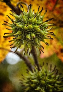 Farther down in our pasture on our farm in Randolph County is a large sweet gum tree. It’s a spot I find myself returning to from time to time and year to year to make photographs. Not as colorful as maples in the fall, I somehow find the gum tree more interesting; the shape of a leaf on a lichen covered rock, and of course those prickly gum balls that are still green this time of year. Glad they’re in the pasture and not in my yard.