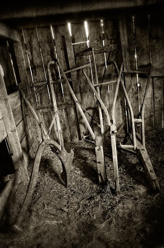 Old horse (or mule) drawn plows sit in a barn on our farm in Randolph County, North Carolina. Last used probably some 70 years ago, nevertheless they stay at the ready.