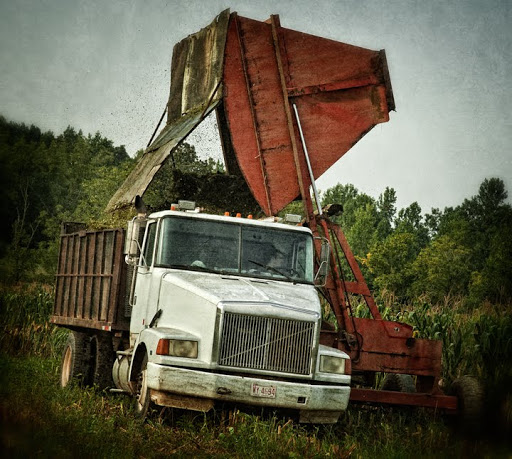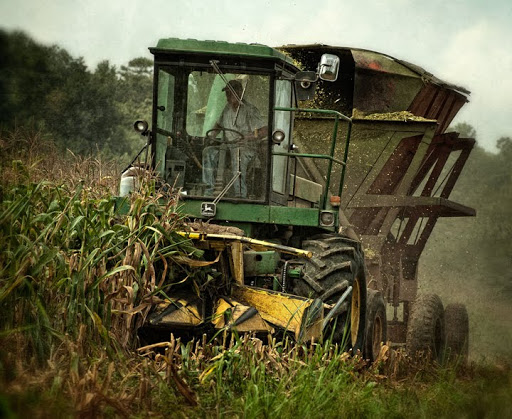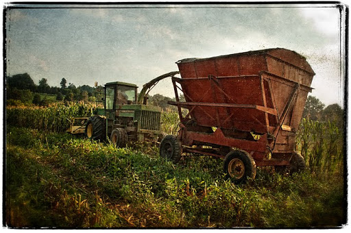 The image above is rather poignant to me, which I guess seems rather odd, because its a shot of farm equipment in a field. The photo is of cutting silage corn, and I truly love to cut silage. I grew up on a dairy farm and every year in late August we cut silage. We did it with another dairy family, the Williams, with whom we shared a cutter and all the labor. Two families, fathers and grandfathers, sons and brothers would all get together and work together to harvest the corn on both of our farms. Things have changed a lot over the years. The Williams brothers (who still dairy farm) cut more silage in two hours on Saturday than we did in a week, but the feeling of that combined labor is still there. This year the brothers had a major breakdown on their equipment, so Frank White from Liberty brought his cutting equipment in to finish the harvest.