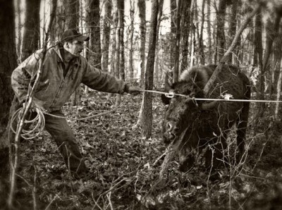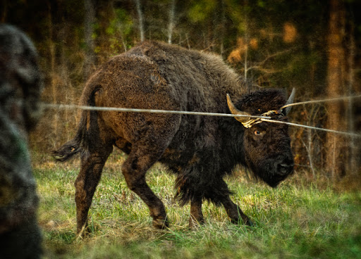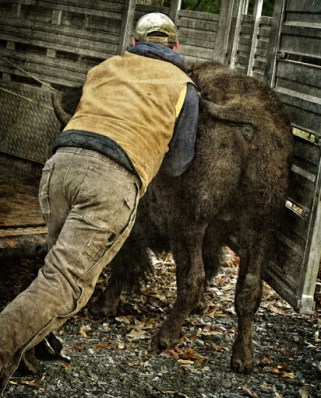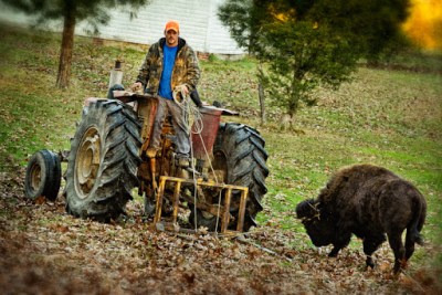 Most folks probably think that it’s boring living out in the country in a place like Grays Chapel, but to be perfectly honest, some days it gets quite exciting. On Tuesday my wife called and told me a buffalo was walking down the road in front of our home, something that normally doesn’t happen in North Carolina. I made a few calls, and sure enough found out that neighbor Matthew Walker owns several buffalo and as livestock are apt to do, had 3 animals get out out of his pasture. Yesterday afternoon Matthew located an eighteen month old male in the woods across from our house and my son Tristan and I went over to watch and give a hand. With the help of a little tranquilizer, 3 ropes, a tractor and several men, we were able to lead the wayward bison out of the trees and onto a livestock trailer with a minimum of stress and no casualties.