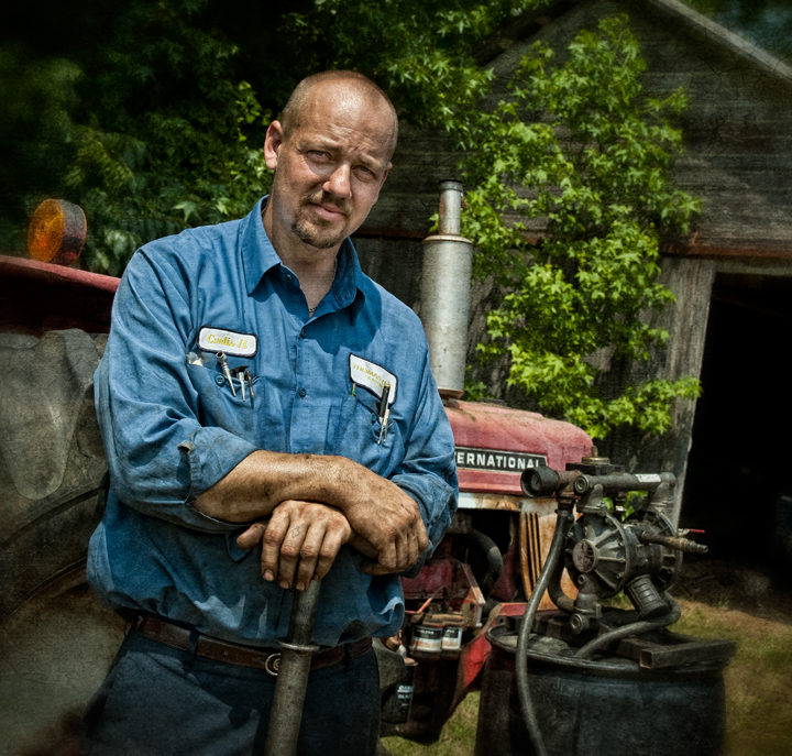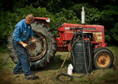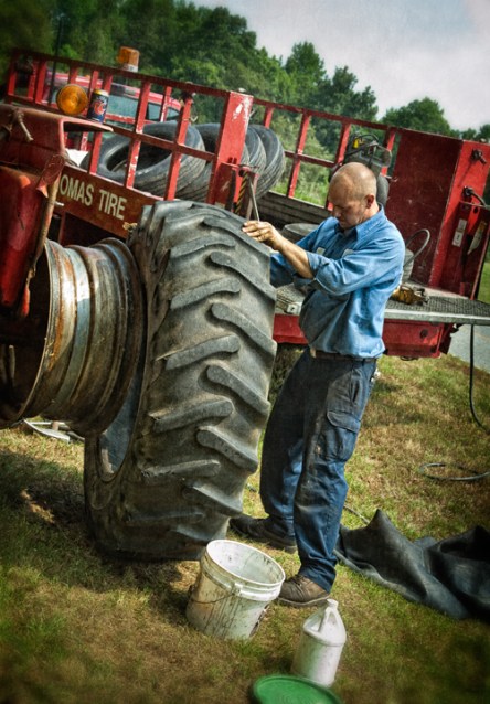 For those of you who have wondered what happens when you have a flat tire on a tractor, fyi, you don’t take the tire and rim to a tire shop, the shop comes to you. Curtis Hildreth from Thomas Tire in Asheboro, North Carolina came to the farm to fix a leak on my old International. Before he could remove the tire from the rim and replace the tube, he had to pump out about 55 gallons of fluid. The “water” is in the tires to add weight and help provide traction. Air powered pumps and jacks helped, but pure muscle did most of the work.