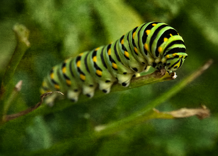 A black swallowtail caterpillar, one of about twenty-five or so on the parsley in our garden today. Looks like we were spared the hurricane and we’ll have a new crop of butterflies.