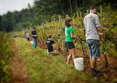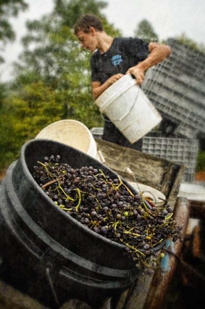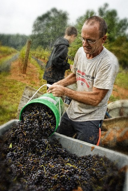 Early September means grape harvest for Leslie and Norm Zimmerman of Zimmerman Vineyards, a family run winery in Trinity, North Carolina. Family and neighbors get together on this day to pick Merlot grapes. There was an overcast and a little rain, which made things a little more comfortable for the pickers. The Merlot wine should be good, because Norm said the sugar content was real high this year. For information on Zimmerman wines, tastings and venue info, go to http://www.zimmermanvineyards.net/#.
