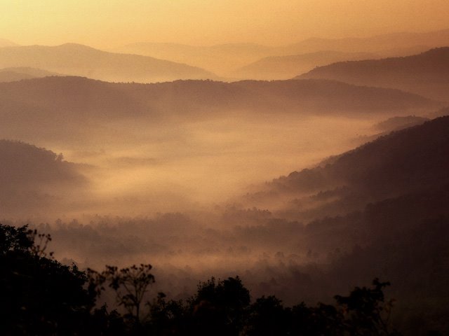 Mist rises from a valley below the Blue Ridge Parkway at sunrise near Boone, North Carolina.