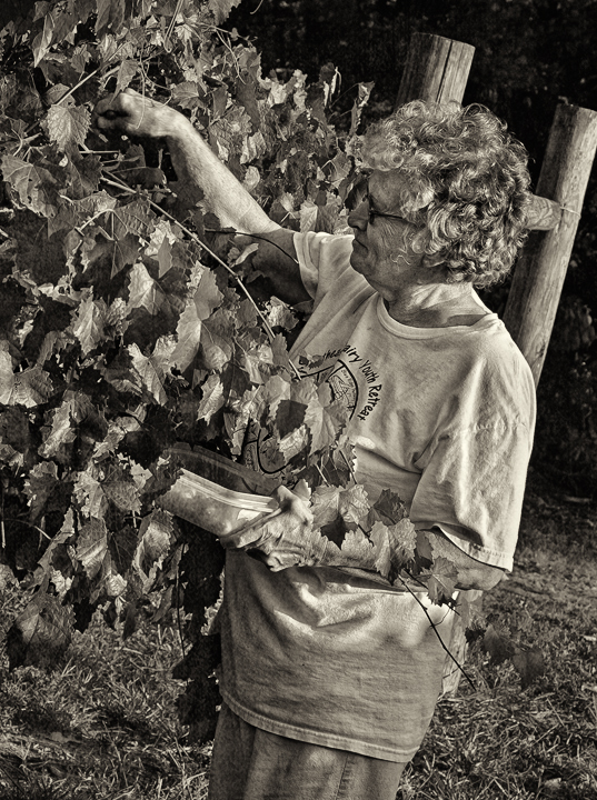 Darrel and Tammy Smith are raising several varieties of muscadine grapes on their farm in Grays Chapel, North Carolina. They pick them for both table use and wine. Muscadines are the only grapes native to the Southeastern United States, and include the brown variety folks often call scuppernongs. Their vineyard is located on the slopes of Caudle’s Mountain, one of the most scenic spots in Randolph County.