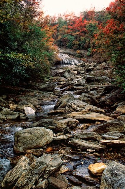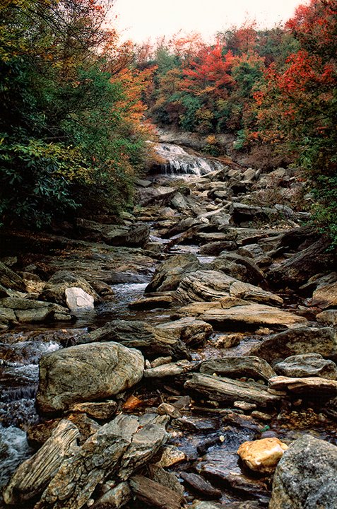 October is a month of change in North Carolina. Starting in the mountains and moving east, Mother Nature makes the transition from summer to winter with her brilliant displays of color. I think this is my favorite time of year, although I do dread to see the cold and gray of winter coming. This image is of Yellowstone Falls, just off the Blue Ridge Parkway near Waynesville. It’s located in the Black Balsam/Graveyard Fields area of Pisgah National Forest, one of the wildest and most beautiful spots in the Blue Ridge.