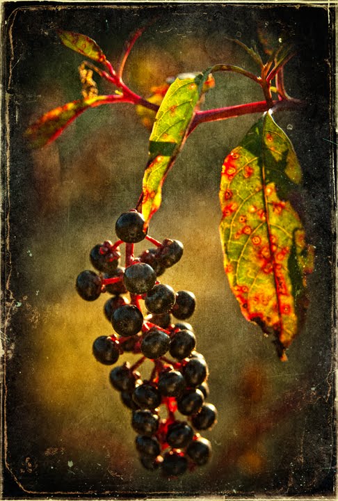 A sign of the end of summer and the beginning of Fall, poke berries shine along a fence line on our farm in Grays Chapel, North Carolina. Poke greens can be eaten by humans when the plant is young, but the berries will become food for the birds.