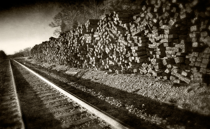 Norfolk and Southern has been working on their line between Liberty and Greensboro, North Carolina, replacing old wooden ties. They’ve been stacking them along the track near Pleasant Garden and they have created a mountain of sorts.