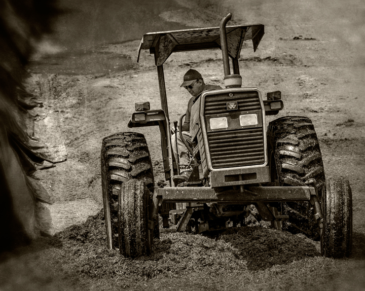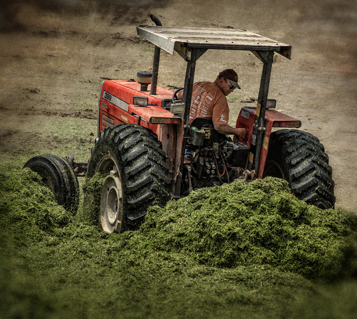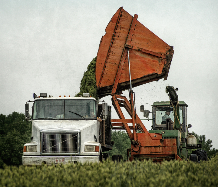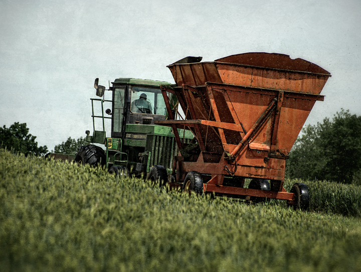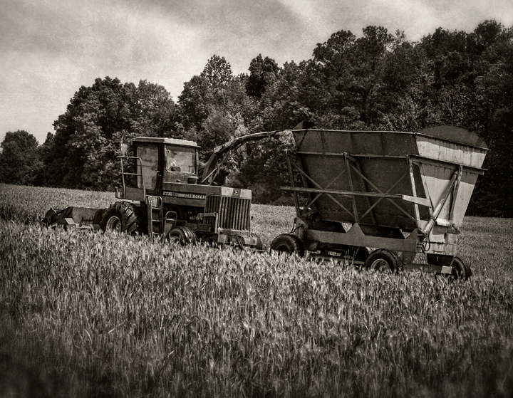 Neighbors Rick, Greg and Michael Williams of Williams Dairy cut spring silage near my home in Grays Chapel, North Carolina. They are cutting a mixture of wheat and barley, chopping it, and putting it in a large trench silo where the grain will pickle and be used for dairy feed.