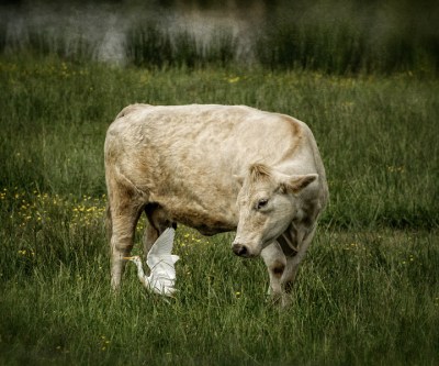 I’ve seen photos of cattle egrets in Africa and more tropical areas of the world, but they are now moving into North America where they feed on insects and such stirred up as cattle graze. Apparently this cow in Guilford County, North Carolina isn’t completely familiar with the species yet.
