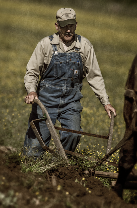 A farmer plows behind a team of horses in Caldwell County, North Carolina. A helper is driving the horses to his side, thus, no lines can be seen.