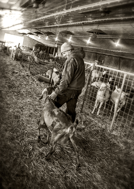 The new goat kids are hitting the ground fast these days at Lindale Dairy near Silk Hope, North Carolina. Farm owner Neil Lindley works with his animals in the goat barn on his organic dairy. Neil produces organic cows milk and this year is starting to furnish goat’s milk to my neighbors at Goat Lady Dairy in Grays Chapel, North Carolina.