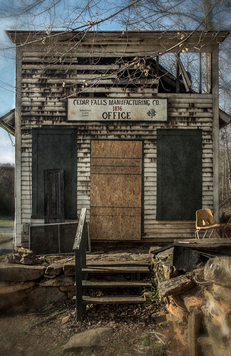 The old Cedar Falls Post Office. A detail from a few years ago, an image from three weeks ago, and finally a view after one evening of suspected arson. Cedar Falls, North Carolina.