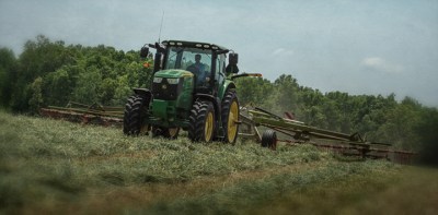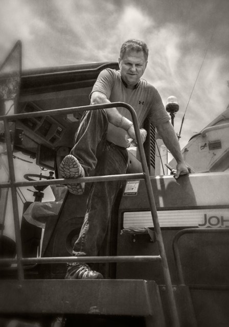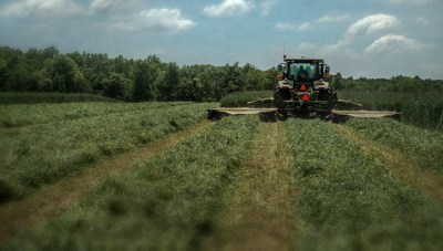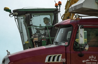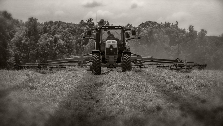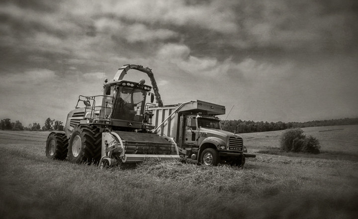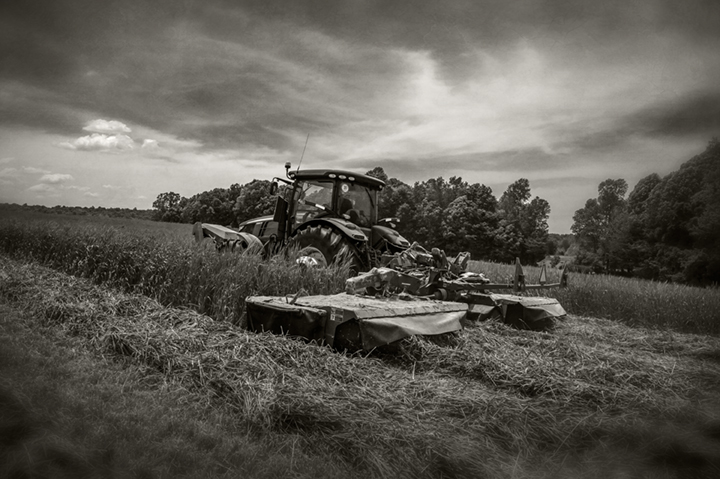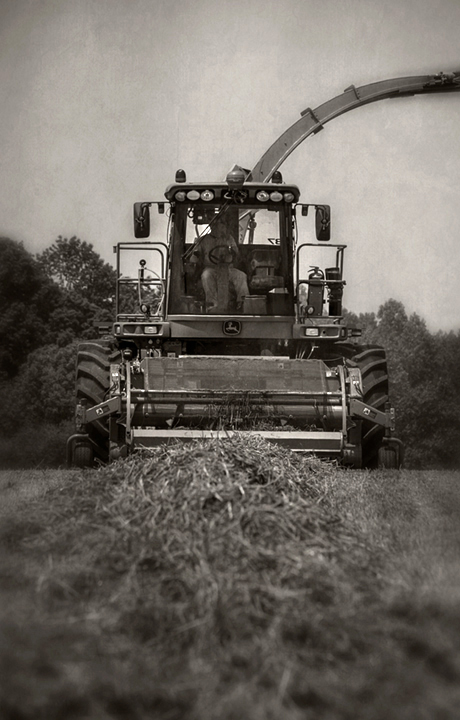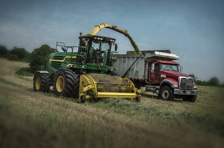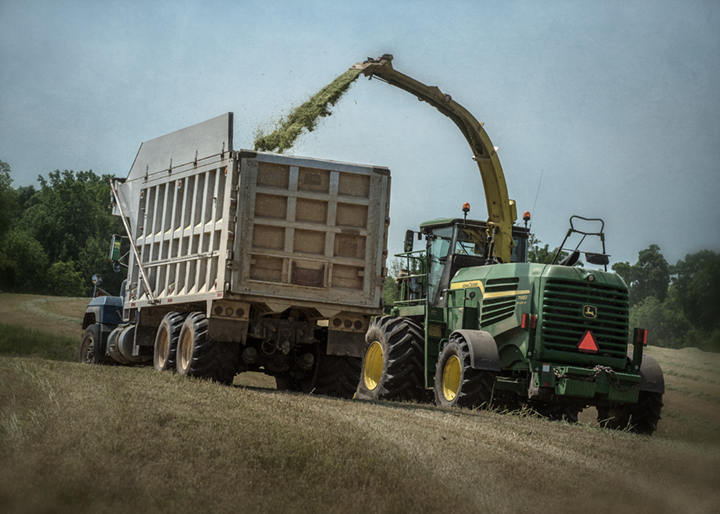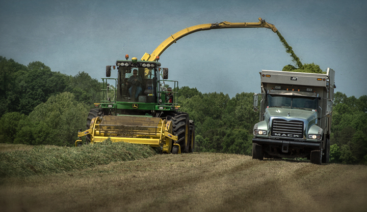 John Mathis and his family from Mathis Farms of Roaring River, North Carolina cut small grain silage for a local dairy farm near Randleman, North Carolina. The Mathis family grows several thousand acres of corn and grain silage feed each year for dairies across the state.
