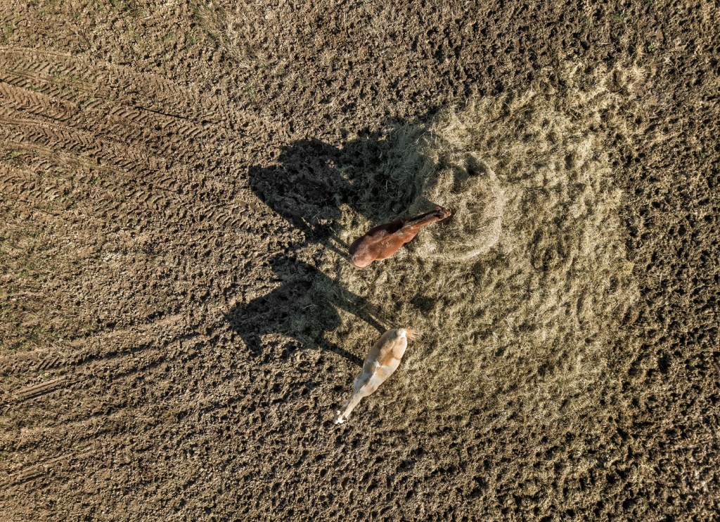Horses feeding on hay on Routh Road in Grays Chapel, North Carolina.