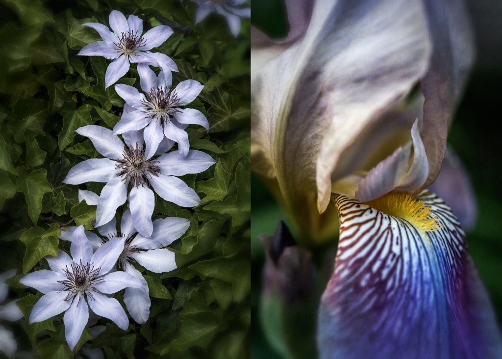 Clematis and iris. In the garden in Grays Chapel, North Carolina.