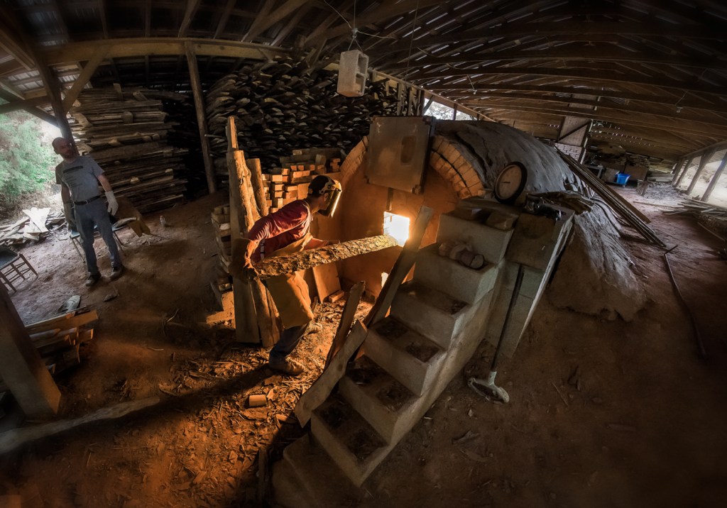 Matthew Kelly feeds wood into the kiln at Joseph Sand Pottery. Randleman, North Carolina.