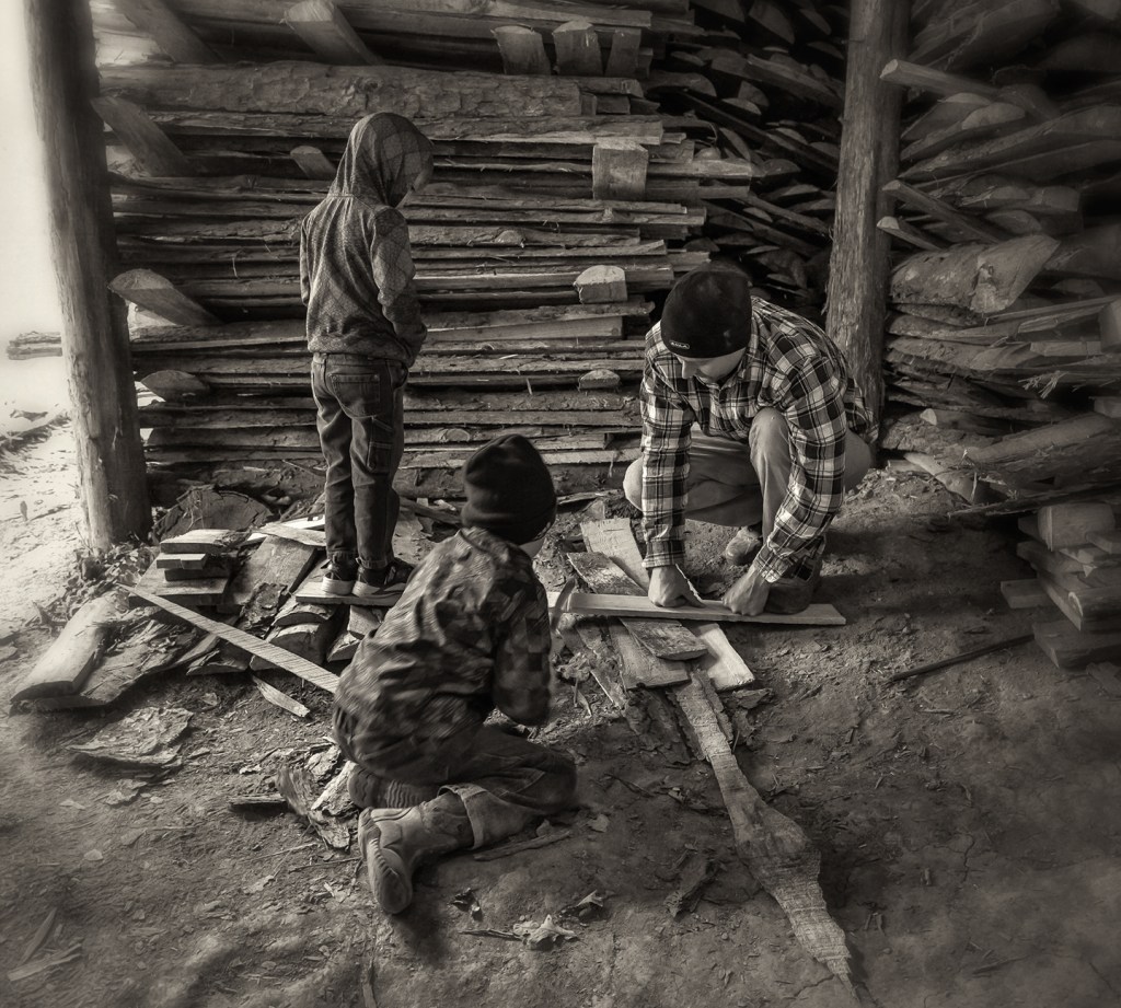 Potter Joseph Sand and sons saw a pine slab from the stack to go into his kiln firing. Randleman, North Carolina.