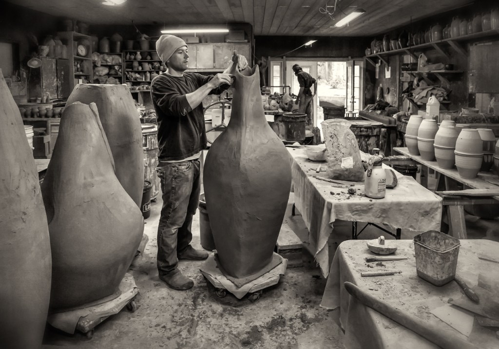Joseph Sand works on large pieces in his studio at Joseph Sand Pottery. Randleman, North Carolina.