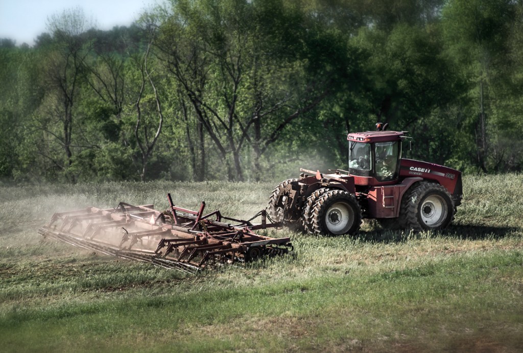 Incorporating wheat as green fertilizer on corn land. Near Liberty, North Carolina.