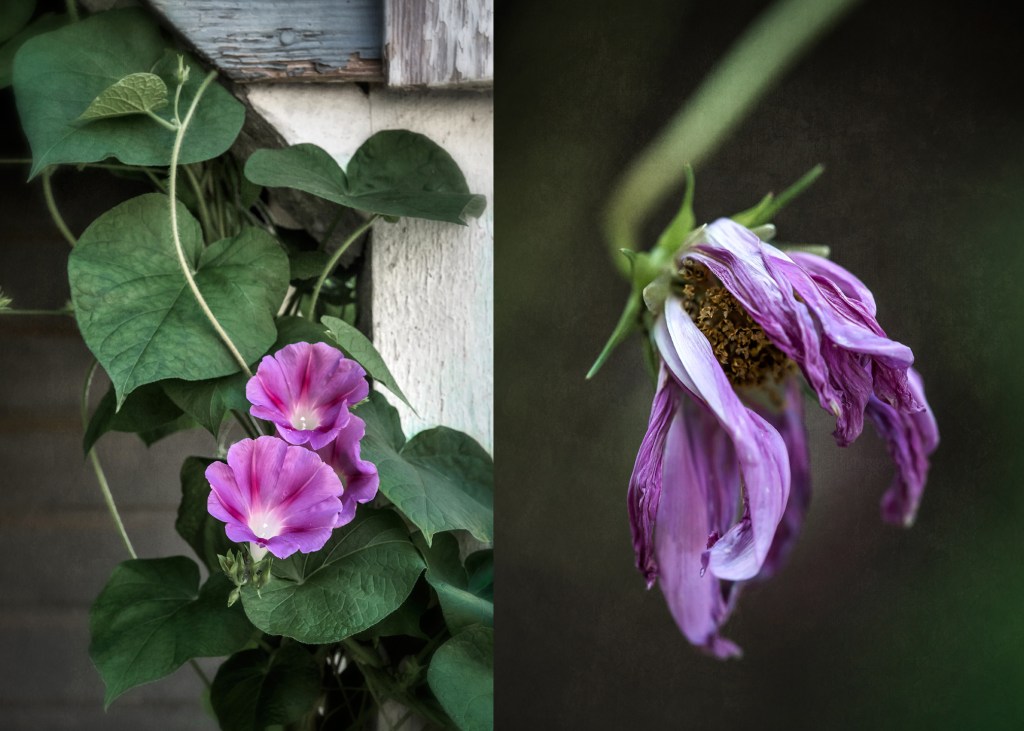 Morning glory and and wilted cosmos. Grays Chapel, North Carolina.