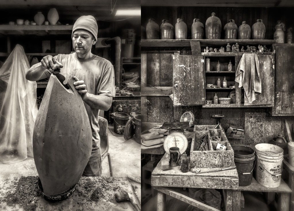 Roughing in a large pot. Joseph Sand Pottery. Randleman, North Carolina.