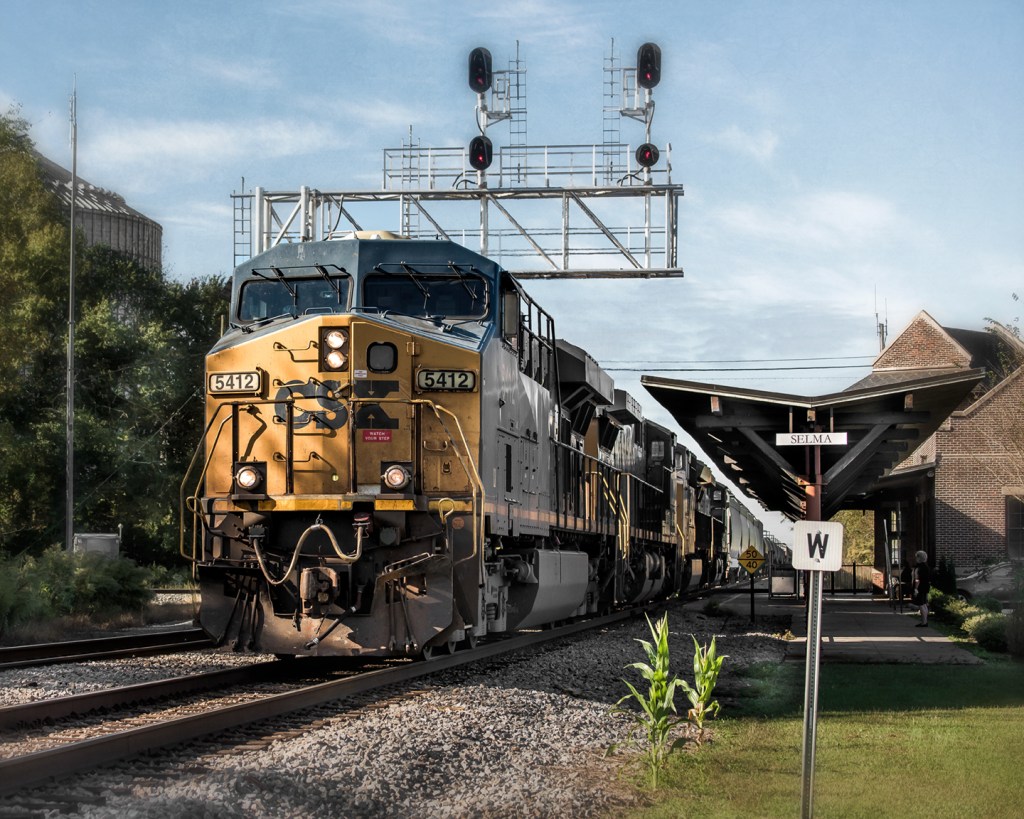 A CSX freight rolls past the station in Selma, North Carolina. The corn sprouting in the foreground came from seed from a passing grain car.
