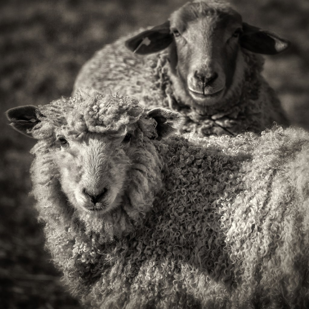 A Leicester Longwool and a Tunis heritage breed sheep at Providence Farm. McLeansville, North Carolina.