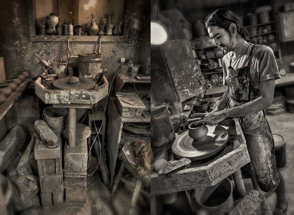 Eamon Rogers, apprentice, at the wheel at Joseph Sand Pottery. Randleman, North Carolina