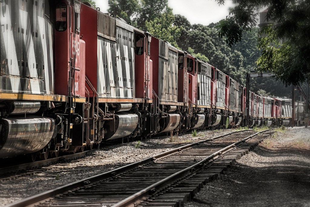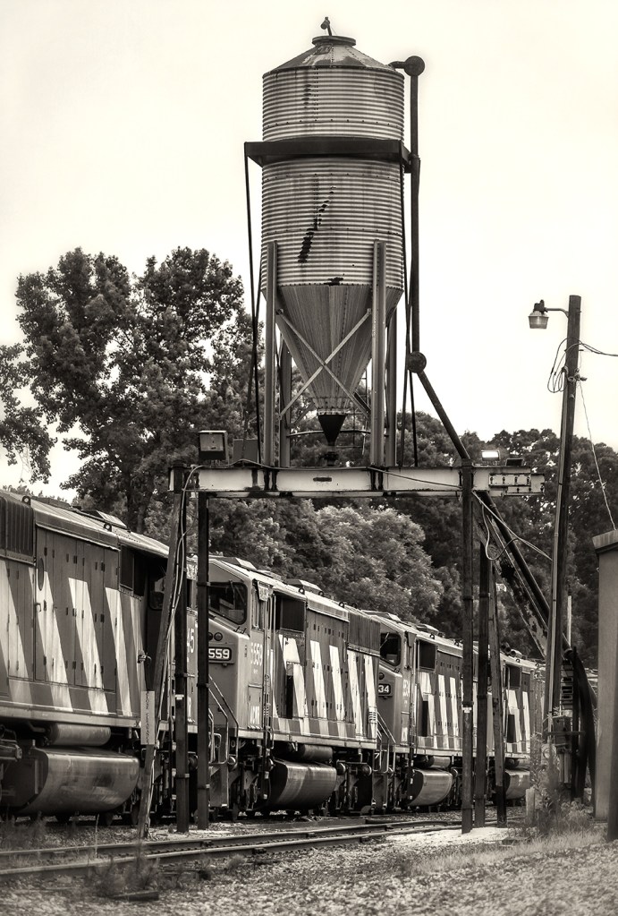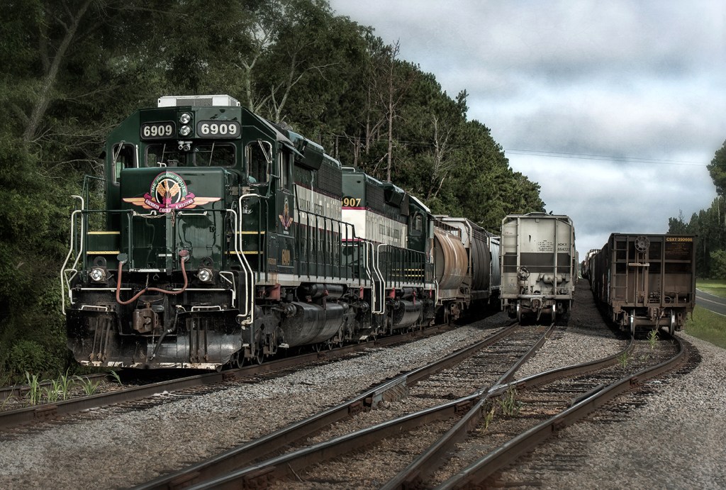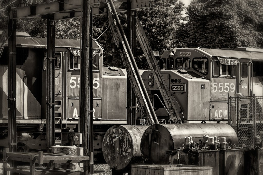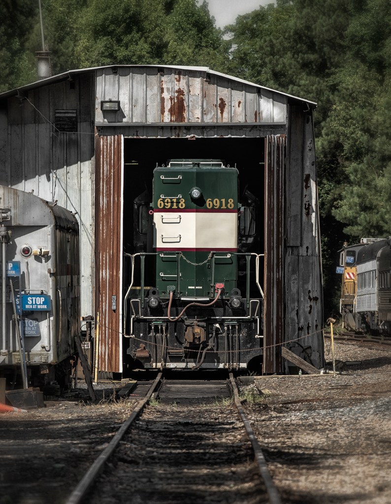 A locomotive in the maintenance shed at the Star, NC yard, a line of former Canadian National units in storage on the yard and an ACWR consist on a siding near Candor, NC.