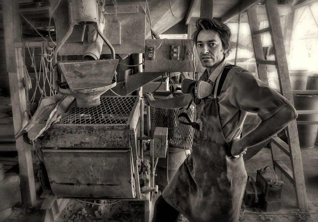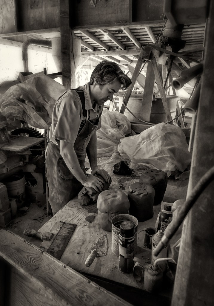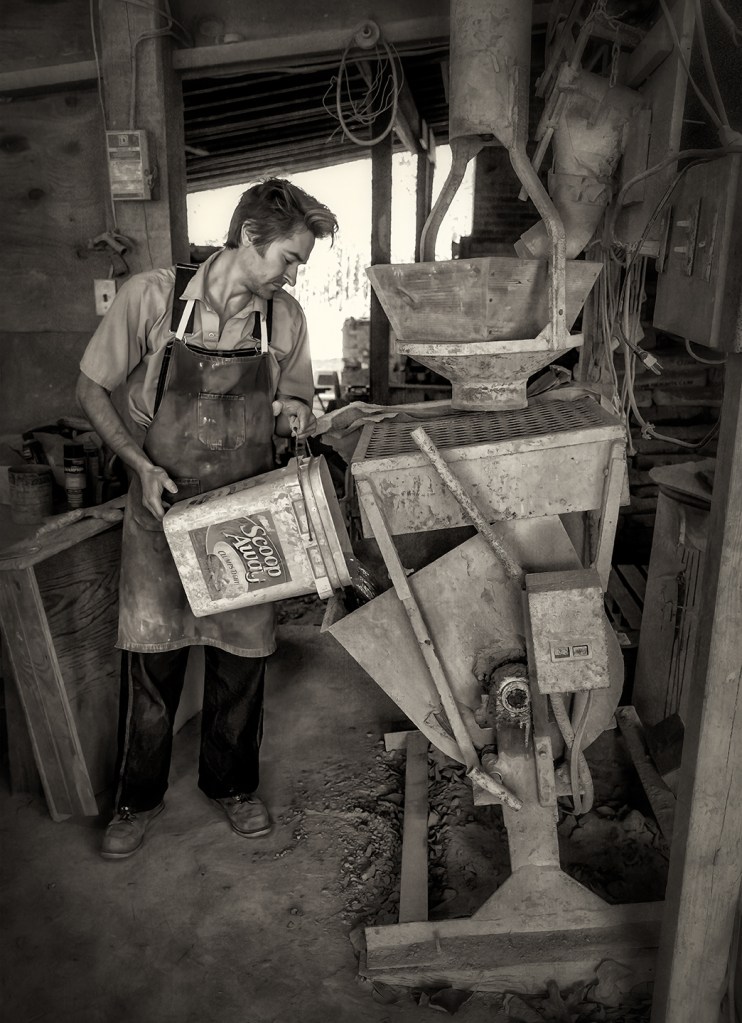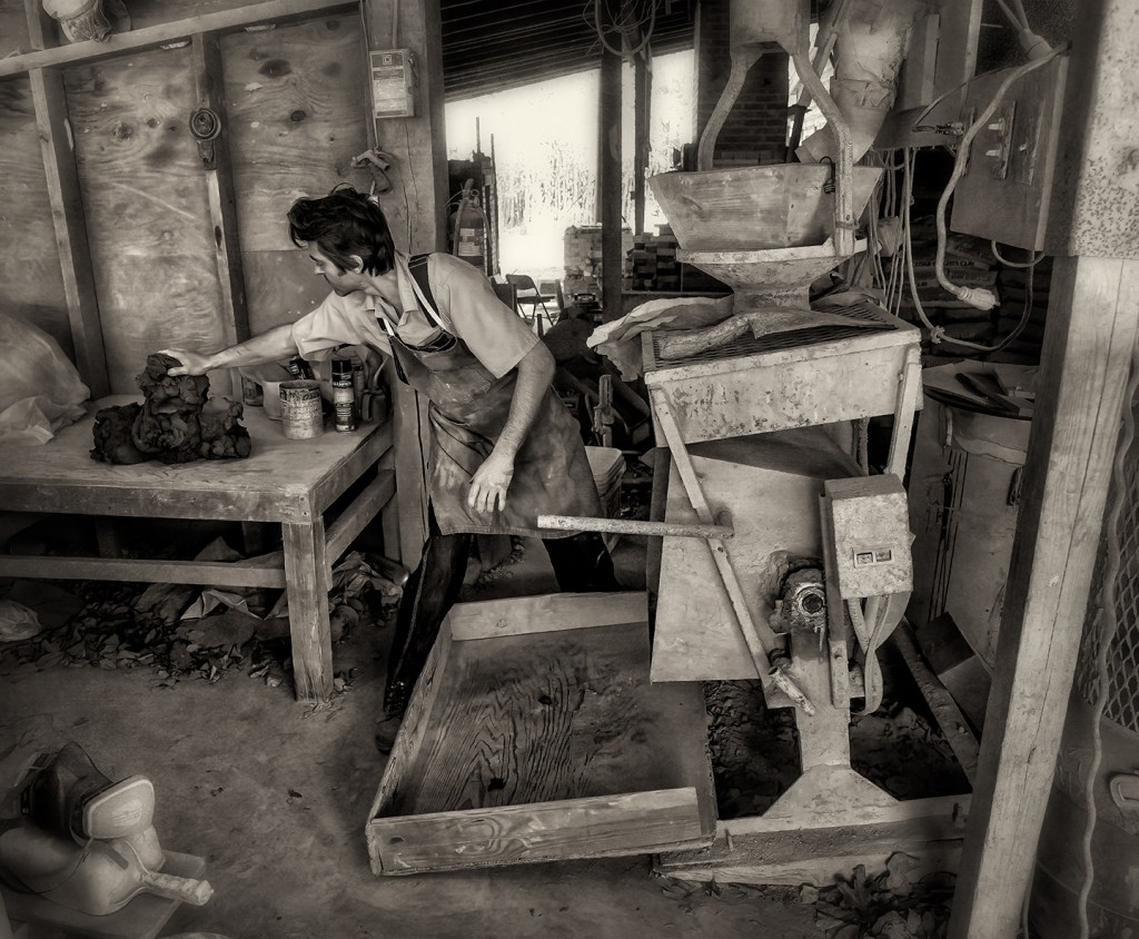 Traditional potters Jugtown Pottery still dig an process their own clay. Here Travis Owens grinds and mixes clay on a hammer mill near Seagrove, North Carolina.