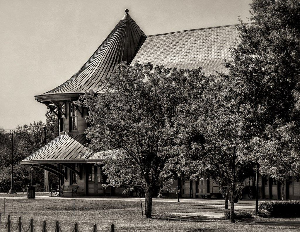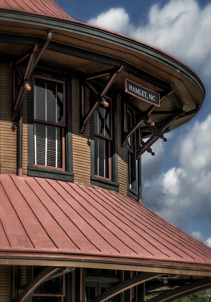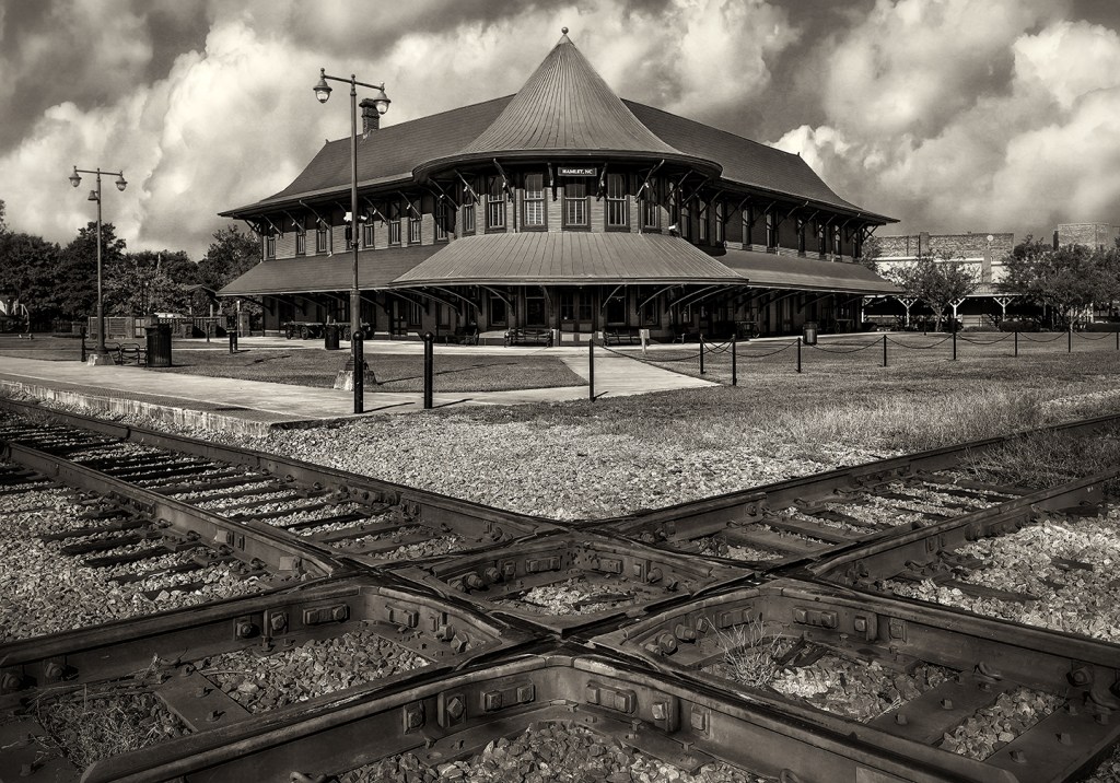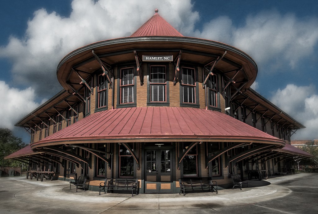 The historic Hamlet depot stands beside the CSX diamond in Hamlet, North Carolina.