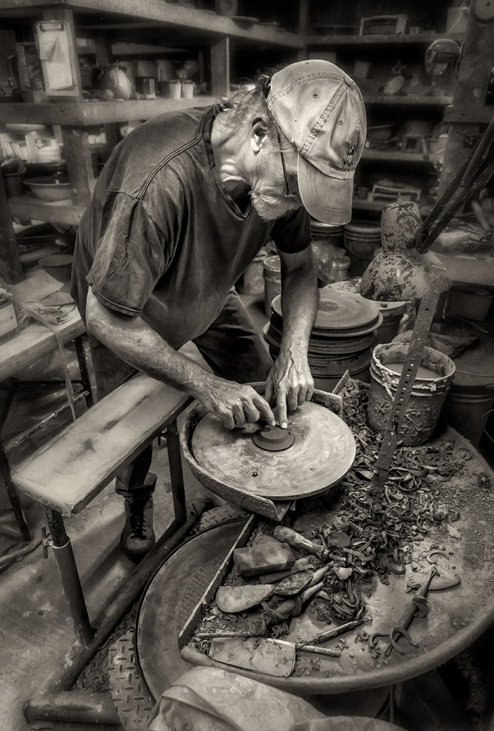 A visit to New Salem Pottery on Friday found potters Hal and Eleanor Pugh slip decorating this year’s Christmas ornaments. Near Randleman, North Carolina.
