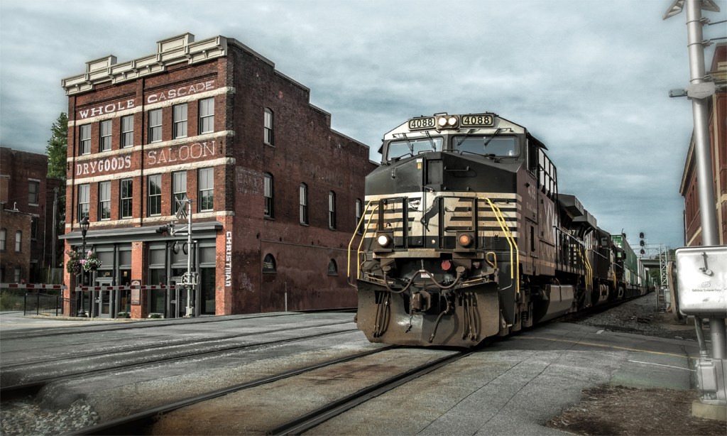 A Norfolk Southern intermodal passes through the crossing at Elm Street in Greensboro, North Carolina, past the restored Cascade Saloon.