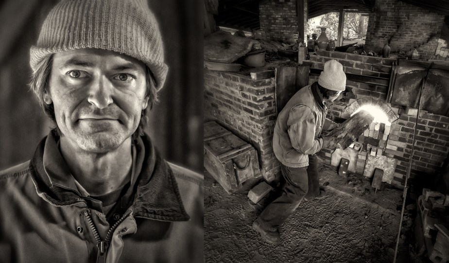 Travis Owens fires one of the groundhog kilns at Jugtown Pottery in northern Moore County, North Carolina.