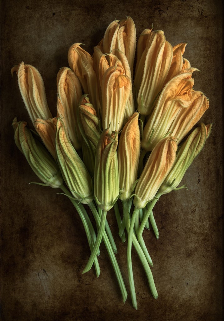 Squash flowers. Still life. From Whitaker Farms. Grays Chapel, North Carolina.