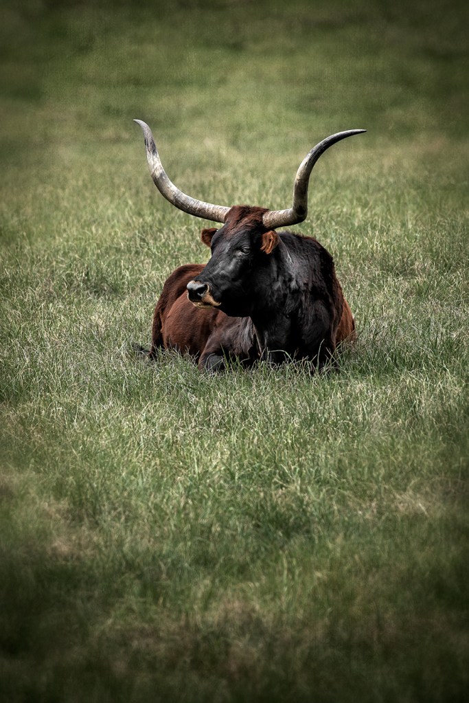 A lone longhorn cow in the pasture. Near Ramseur, North Carolina.