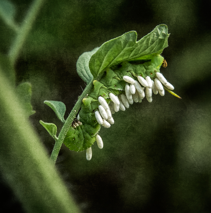 In the Garden Animals, Garden (Photograph copyright 2014 by Dan Routh) Beneficial insects. Braconid wasp larvae on a tomato horn worm. Goodbye horn worm.
