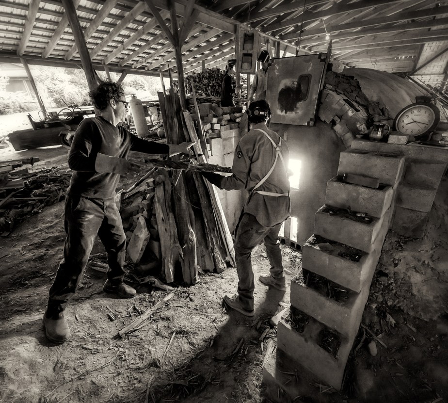 Travis Owens fires one of the groundhog kilns at Jugtown Pottery in northern Moore County, North Carolina.
