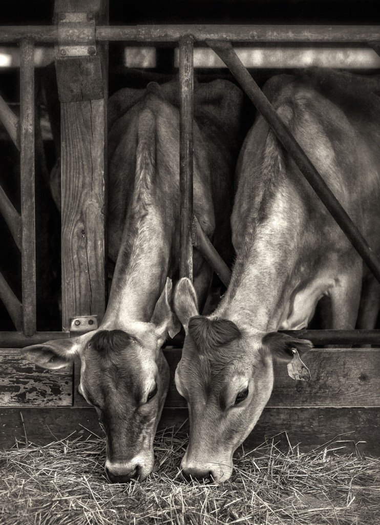 Two Jersey cows eating hay. Chapel Hill, North Carolina.