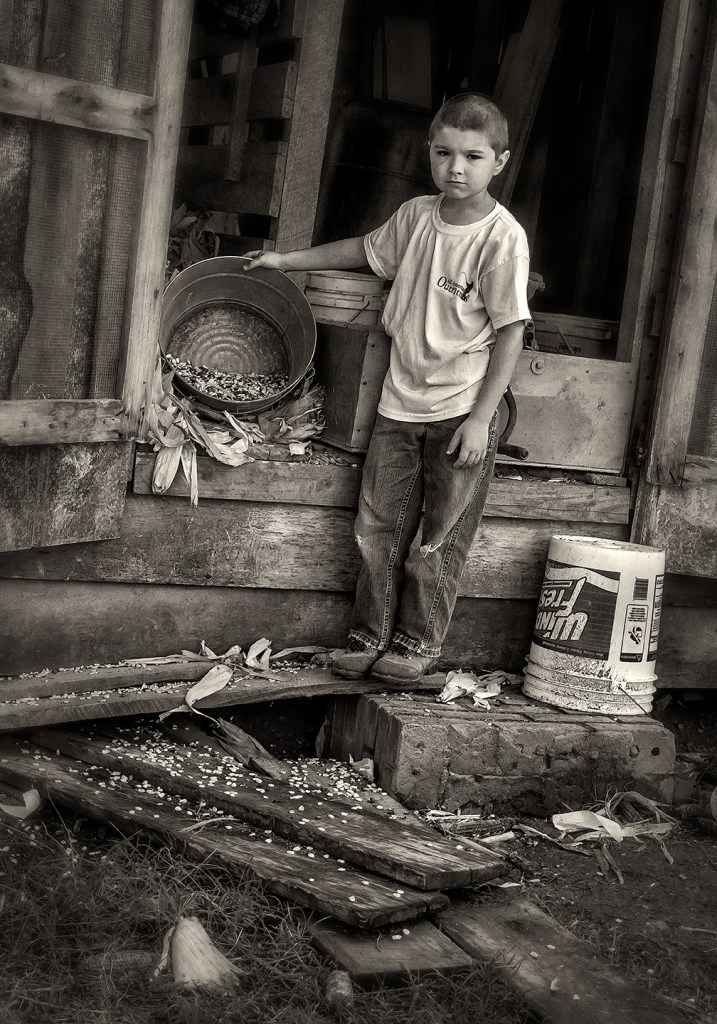 Nicholas shelling corn for the mules. Grays Chapel, North Carolina.