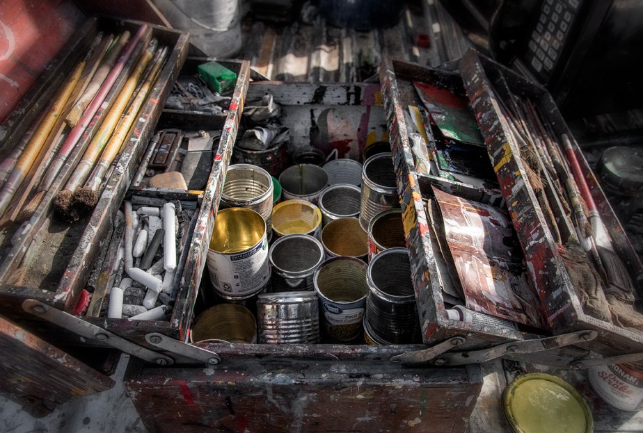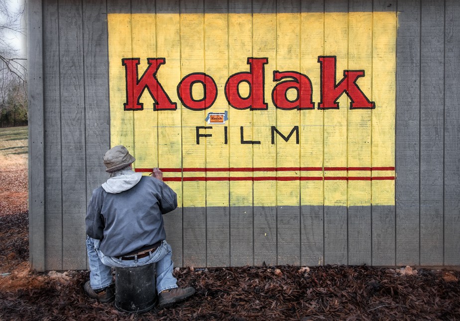 Local artist and sign painter Louis Brady works on a sign on my barn/studio in Grays Chapel, North Carolina.