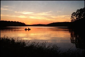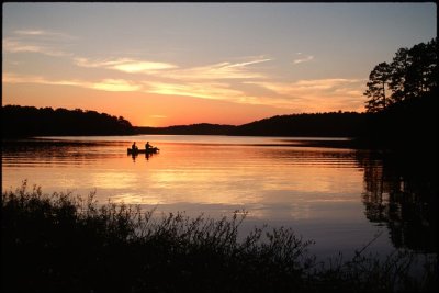 A canoe moves across the water of Badin Lake at sunset in the Uwharrie Mountains of central North Carolina. Formed about 500 million years ago, the Uwharries are one of the oldest mountain ranges in North America. Once rising to almost 20,000 feet, the eons have eroded them down to about 1100 feet at their highest point.