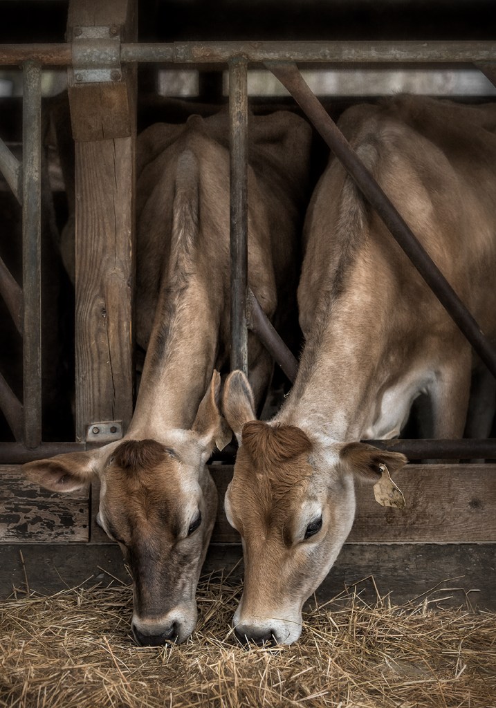 Two Jersey cows eating hay. Chapel Hill, North Carolina.