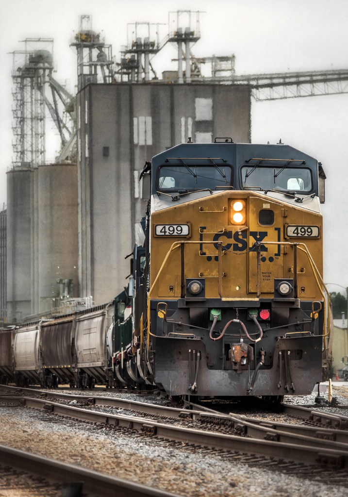 CSX power units lead a string of grain cars at the Perdue feed mill on the Aberdeen, Carolina and Western line in Candor, North Carolina.