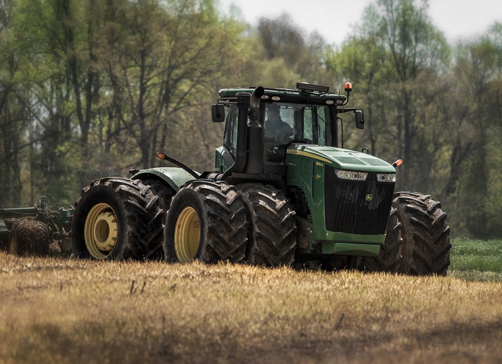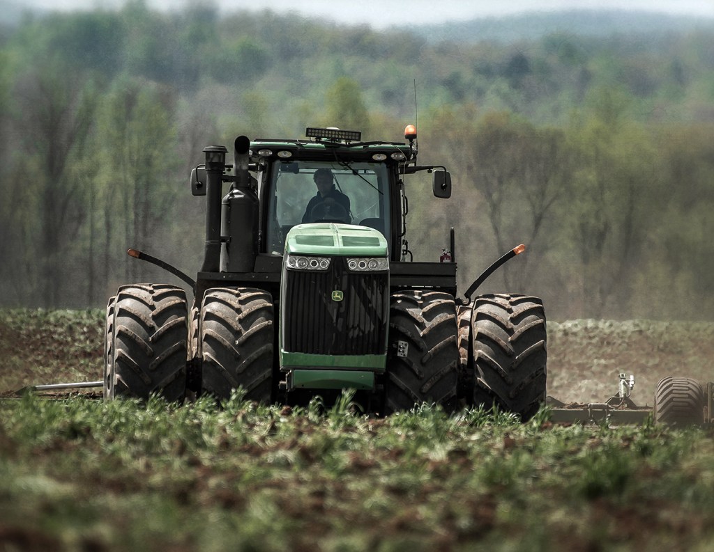 Michael Williams works on rebuilding the PTO on a tractor in his shop at Williams Dairy. Grays Chapel, North Carolina.